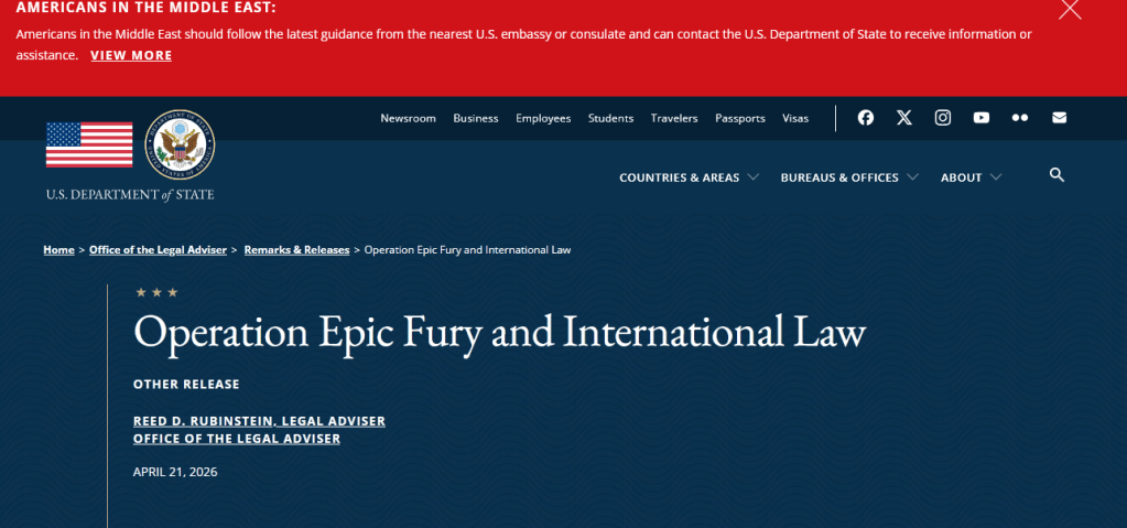 Publié le 21 avril par le conseiller juridique Reed D. Rubinstein sur le site web du gouvernement, le document intitulé « Opération Epic Fury et droit international » expose la « justification » des attaques américaines lancées le 28 février contre les systèmes de missiles, les moyens navals, les installations de production et les infrastructures nucléaires iraniens.