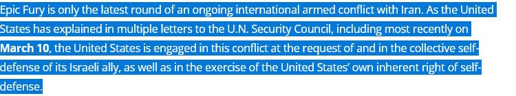 L’opération « Epic Fury » n’est que le dernier épisode en date d’un conflit armé international en cours avec l’Iran. Comme les États-Unis l’ont expliqué dans plusieurs lettres adressées au Conseil de sécurité des Nations unies, dont la plus récente date du 10 mars, ils sont engagés dans ce conflit à la demande de leur allié israélien et dans le cadre de la légitime défense collective de celui-ci, ainsi que dans l’exercice de leur propre droit inhérent à la légitime défense.
