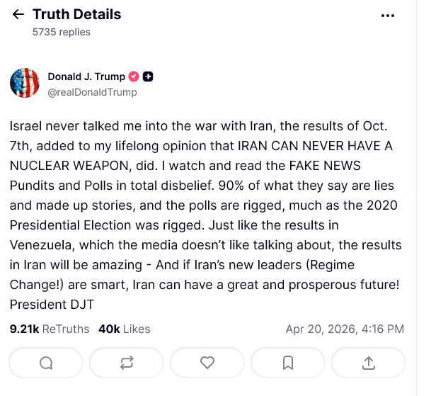 Dans un message publié sur Truth Social, Trump a affirmé : « Israël ne m’a jamais poussé à entrer en guerre. »