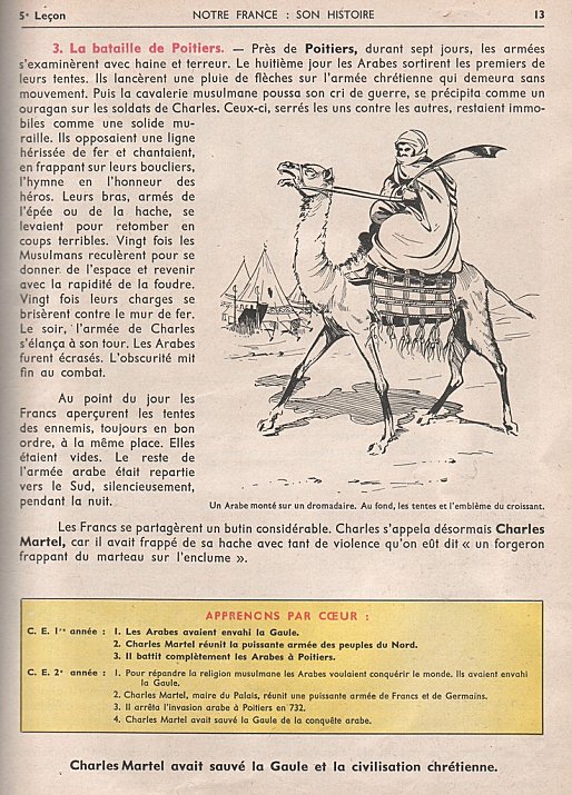 Notre actualité serait-elle la même si la véritable Histoire de Charles Martel était encore enseignée dans les écoles ? Forcément non! (Voir les extraits d’un livre d’Histoire de l’école publique du primaire, des années 50 en fin d’article)