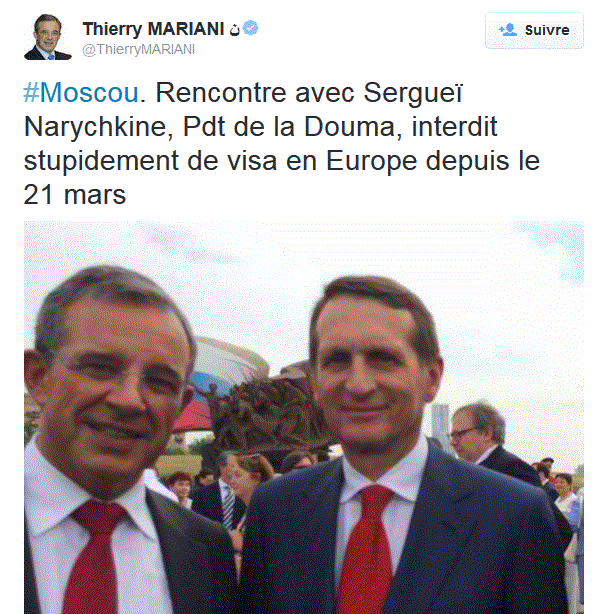 C’est à l’initiative du député républicain, Thierry Mariani, que dix-sept parlementaires (dont 3 sénateurs) sont partis mercredi pour Moscou. Thierry Mariani, Nicolas Dhuicq, Jacques Myard, Yves Pozzo Di Borgo, ainsi que la plupart de leurs compagnons de voyage, sont des récidivistes; en septembre 2014 ils s’étaient déjà rendus en Russie en compagnie de 14 parlementaires pour assurer le Kremlin de leur soutien dans la crise ukrainienne. Ils ont, comme la fois précédente, rencontrer Sergeï Narychkine, le Président de la Douma. L’originalité, cette fois-ci, tient au fait qu’ils se sont rendus en Crimée. Le rattachement de la Crimée à la Russie, selon la volonté de ses habitants, avait été le prétexte aux séries de sanctions que l’Occident a depuis, fulminées contre la Russie.