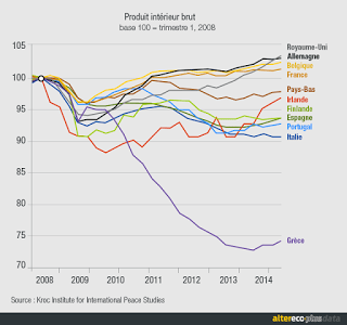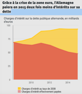 C’est Alterecoplus, d’Alternatives Economiques, qui a levé un aspect peu connu de la crise de la zone euro : le fait qu’elle a permis à l’Allemagne de faire des économies colossales sur le coût de sa dette souveraine, du fait de la divergence des taux d’intérêt entre les pays membres de la zone euro, après la convergence des premières années de la monnaie unique. Les chiffres sont stupéfiants : si les taux payés par l’Allemagne étaient restés stables depuis 2008, Berlin paierait 93 milliards d’intérêts en 2015. Cette année, notre voisin d’outre-Rhin n’en règlera que 48 milliards, soit près de deux fois moins, du fait du choix des investisseurs de privilégier la signature Allemande, la plus plus rassurante dans cette zone euro. Guillaume Duval a fait les comptes : l’Allemagne a économisé 193 milliards depuis 2008 !