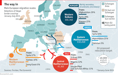 Mais du coup, ces statistiques nous révèlent que l’afflux des migrants en Europe est loin de se limiter aux réfugiés Syriens, qui ne représentent qu’une part, certes non négligeable, mais même pas majoritaire, de toutes les personnes qui rentrent illégalement dans notre continent. The Economist a repris les statistiques de Frontex, qui a recensé les 330 000 migrants illégaux qui sont arrivés en Europe. Un petit tiers seulement, soit environ 100 000, viennent de Syrie. En clair, quand l’Europe ouvre ses portes, elle n’accueille pas que des réfugiés, mais bien davantage des migrants économiques, ce qui peut éventuellement se comprendre en Allemagne, plus difficilement dans les pays où le chômage est élevé. Plus de 60 000 Afghans sont venus et on compte de nombreuses autres nationalités (Kosovo, Erythrée).