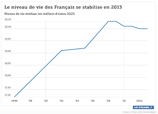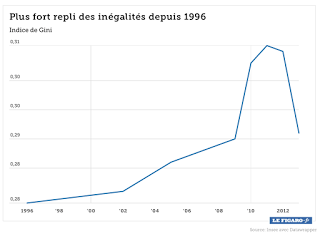Mais cette présentation des choses est insuffisante. En effet, même si les inégalités avaient légèrement baissé en 2012, et que cela constitue donc une deuxième baisse consécutive, il faut noter que le revenu médian (séparant les 50% qui gagnent le plus des 50% qui gagnent le moins), affiche une baisse de 0,1%, ce qui indique a contrario que les revenus moyens ont stagné en 2013, à un niveau de 1667 euros que l’on ne peut pas considérer comme suffisamment élevé. En outre, comme le montre le graphique du Figaro, on constate que le revenu médian tend à baisser légèrement depuis 2008, phénomène inquiétant. Enfin, on peut également voir que si les inégalités reculent, elles le font après une hausse constante de plus de 15 ans, ce qui relativise l’inversion de tendance, encore trop récente.