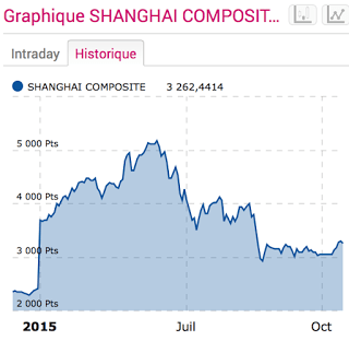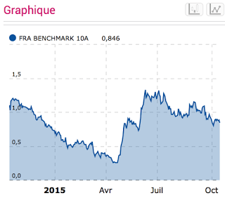 En avril, les taux à 10 ans ont touché des plus bas historiques, à peine 0,25%, alors qu’ils étaient encore à plus de 1% en novembre 2014 ! En mai, les taux sont revenus autour de 0,8%, avant de bondir au-delà de 1,3% juste avant l’effondrement de la bourse de Shanghai, qui a touché son point le plus haut, à 5166 points le 12 juin, avant de tomber sous les 3000 points fin août, une baisse de plus de 40% en moins de trois mois. Mais, comme on pouvait l’anticiper, nous en sommes restés à un ajustement très violent, à relativiser, qui plus est, par le fait que le marché reste plus haut qu’il ne l’était il y a un an (l’indice étant alors au-dessus de 2300 points). A partir de la mi-juillet, les taux à 10 ans, qui oscillaient entre 1,1 et 1,3%, ont baissé d’un cran, autour de 1%, avant de passer sous les 0,9% en octobre.