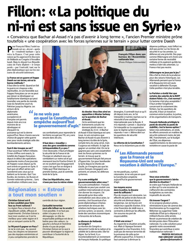 J’ai le sentiment que les événements actuels me donnent plutôt raison. La stratégie du ni-ni : ni Bachar el-Assad, ni Etat Islamique est sans issue. Je suis convaincu que Bachar el-Assad n’a pas d’avenir à long terme à la tête de la Syrie, compte tenu du sang versé, mais l’urgence est militaire. Il s’agit de gagner un combat vital. On ne le gagnera pas sans une coopération avec les forces syriennes sur le terrain. Je trouve que le gouvernement français fait preuve d’hypocrisie. Car pour bombarder la Syrie depuis le Charles de Gaulle, je n’imagine pas que les avions français s’engagent sans prévenir, en amont, les défenses syriennes.
