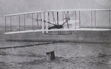 Le 17 décembre 1903, les frères Wibur et Orville Wright (36 et 32 ans) effectuent à tour de rôle quatre vols de quelques dizaines de mètres sur la plage de Kill Devil, à Kitty Hawk, en Caroline du Nord.