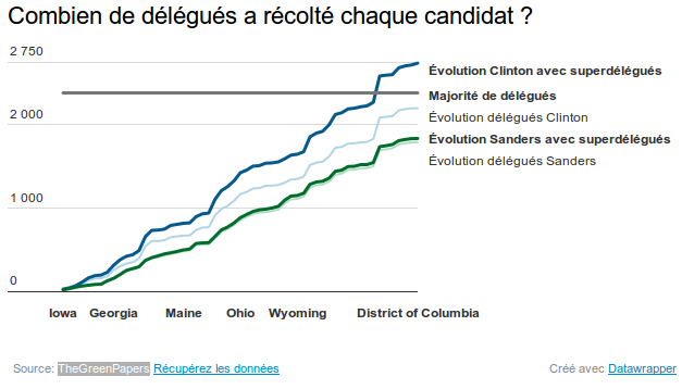 Toutefois, lorsqu’on observe les données des primaires démocrates depuis le début de la course, force est de constater que Hillary Clinton n’a cessé de creuser l’écart.Cet avantage de la candidate s’explique en majeure partie par ses nombreuses victoires remportées dans des États populeux et importants en matière de délégués. L’ex-première dame a remporté 13 des 15 États mettant en jeu le plus de délégués.