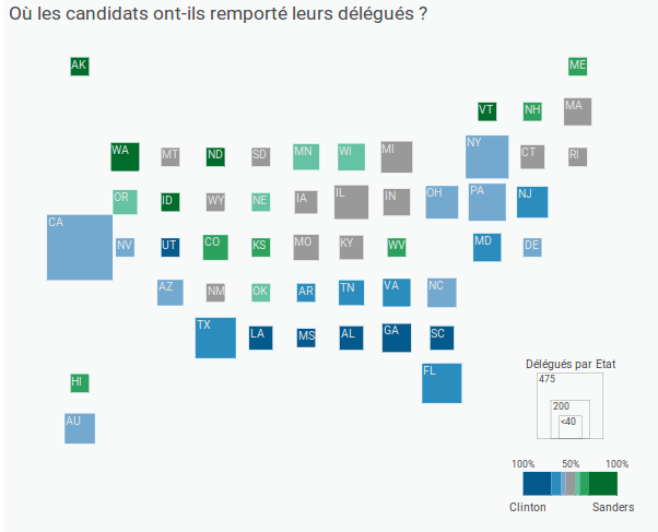 La carte ci-dessous illustre les résultats des deux candidats démocrates en termes de délégués dans chaque État. Les super-délégués sont exclus du calcul.