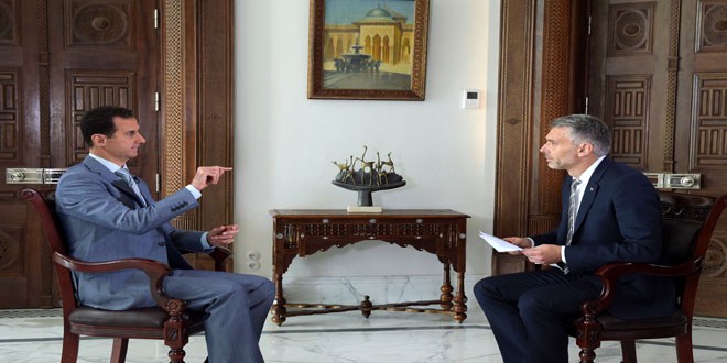 Président Assad : Exactement, telle est notre mission, conformément à la Constitution, conformément à la loi ; nous devons protéger le peuple, nous devons nous débarrasser des terroristes d’Alep. Voilà comment nous pouvons protéger les civils. Comment pouvez-vous les protéger tant qu’ils sont soumis au contrôle des terroristes ? Ils sont tués par eux, et ils sont entièrement contrôlés par les terroristes. Notre rôle est-il de nous asseoir de côté et de regarder ? Est-ce la façon dont nous pouvons protéger le peuple syrien ? Nous devons attaquer les terroristes, c’est une évidence.