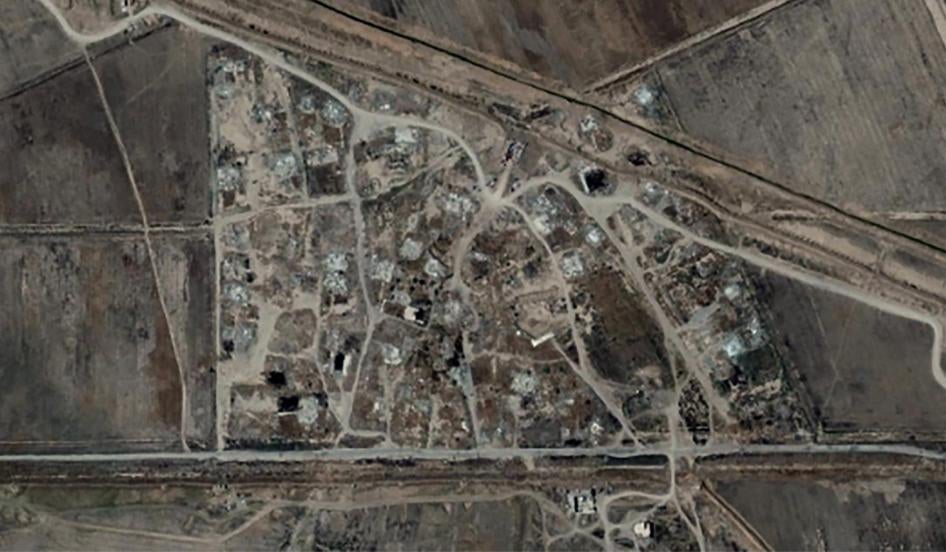 Sur ces 21 villes et villages visités par Human Rights Watch, 13 portaient les marques d’une destruction importante. A l’exception de trois d’entre elles, toutes ces localités avaient au moins la moitié de leurs bâtiments en ruine et sept avaient été vidées de leurs résidents. Pour les 62 autres villes et villages visités, les images satellites révèlent des dommages considérables qui témoignent d’incendies et de l’usage de l’artillerie lourde et d’explosifs de forte puissance, ce qui les distinguent, en apparence, des images de destructions causées par les frappes aériennes ou les échanges de tirs fournis qui ont eu lieu avant le retrait des combattants de l’EI de ces localités. Le manque de témoignages ne permet malheureusement pas de tirer de conclusions définitives sur les circonstances et la responsabilité des destructions causées dans ces zones.