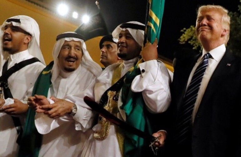 - Donald Trump participant à la danse du sabre avec le roi Salmane (au centre)