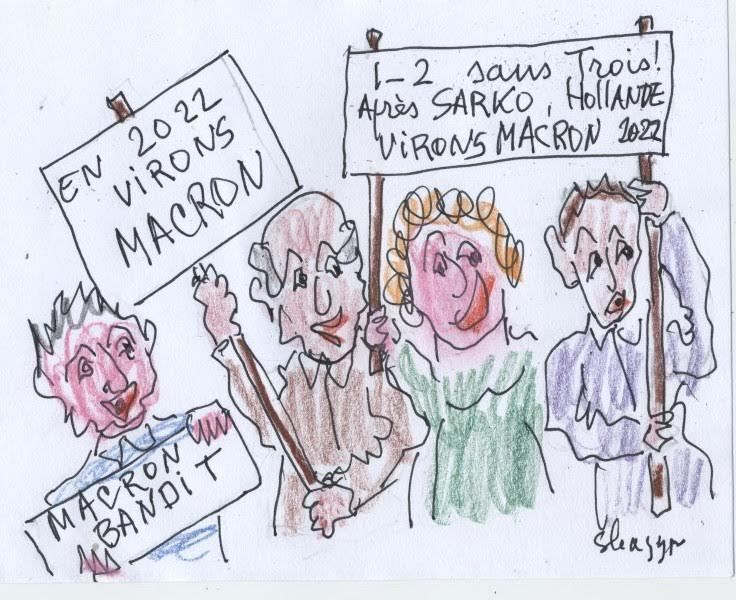Pour le souffle qui nous reste, nous les retraités allons faire campagne pour q’en 2022, tu rejoignes tes prédécesseurs sur le pilori de la place de la République. Deux sans trois et tu seras après Sarko, Sleazy Hollande, le suivant. Mais nous n’avons pas d’inquiétude pour ton avenir : le pantouflage dans une banque t’attend et tu donneras des conférences à 500 000 euros pour deux heures de vantardises.