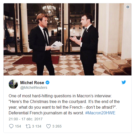 Traduction : « L’une des questions les plus percutantes de l’interview de Macron : “Voici le sapin de Noël dans la cour, c’est la fin de l’année, que voulez-vous dire aux Français, n’ayez pas peur ?” Le pire du journalisme de déférence à la française. »