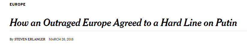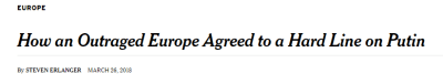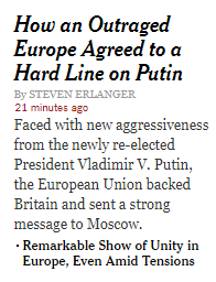 L’opération fonctionne. La requalification est en cours. Une coalition se met ainsi en place, autour des intérêts protégeant la globalisation. Le danger existentiel pour cette transformation du monde issu de la Seconde Guerre mondiale vient de la Russie, qui sans remettre en cause l’intégration économique refuse la dissolution politique. Or l’un ne va pas sans l’autre, tout a un prix et le rappel à l’ordre est violent. Mais la Russie signe et persiste, elle a repris sa place dans l’ordre mondial et la globalisation est en danger: si elle n’est pas globale, elle n’est pas. La politique souveraine de la Russie est alors décrite comme particulièrement agressive, comme dans cet article du New York Times, où l’on peut lire en première page de leur site: