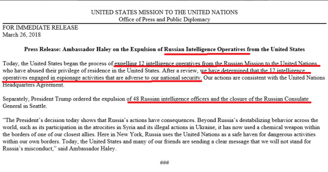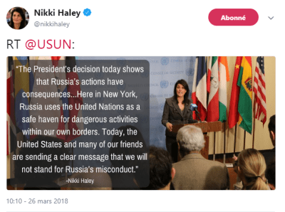 Les Etats-Unis s’arrogent ainsi, en violation des Conventions internationales de 1946 et de 1947, réglementant la présence des délégations étrangères sur le territoire américain et obligeant les Etats-Unis à garantir l’accès des diplomates ainsi accrédités à leur lieu de fonction, le droit d’expulser 12 diplomates russes travaillant à l’ONU. De cette manière, les Etats-Unis prennent des sanctions au nom de l’ONU, ce qui ne dérange en rien la communauté internationale qui accuse la Russie de violer systématiquement le droit international.