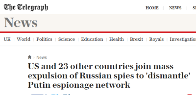 La presse anglo-saxonne reprend, en toute indépendance, le même crédo répété en stéréo par Thérésa May. L’on apprend ainsi dans The Telegraph, que selon la Grande-Bretagne, il ne s’agit pas d’une expulsion de diplomates, mais du démantèlement d’un réseau d’espions russes travaillant en Occident sous statut diplomatique: