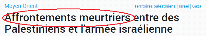 Autre tare récurrente dès qu’il s’agit du conflit opposant les Palestiniens à Israël : présenter ce qui relève de massacre comme des « affrontements » voire de simples « tensions » contribue à invisibiliser les rapports de force en minimisant les violences d’une part et en considérant, de l’autre, que les deux « camps » seraient à égalité. Ce vocabulaire culmine dans l’invisibilisation même de l’intervention meurtrière des militaires israéliens : « les affrontement ont causé la mort d’au moins douze personnes », « affrontements et face-à-face meurtriers » ou encore « la manifestation a fait 16 morts ».