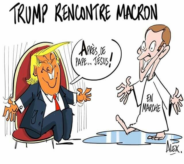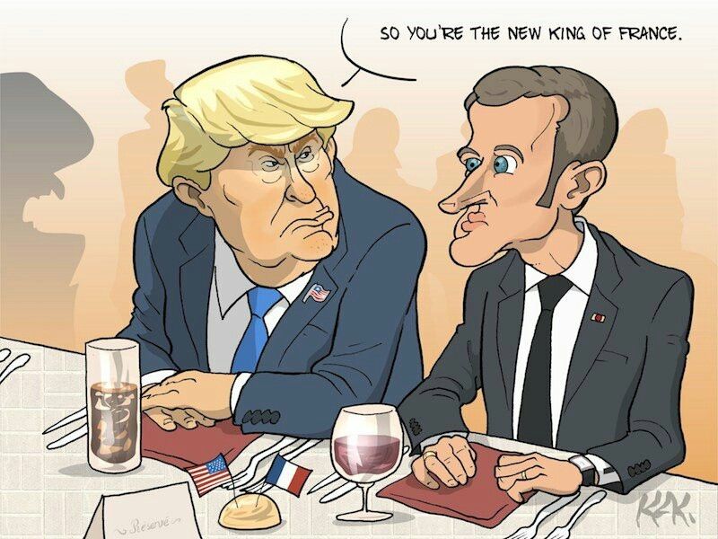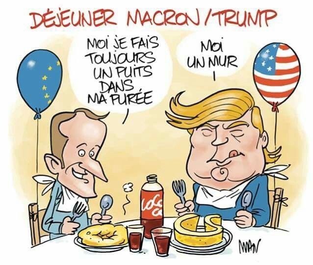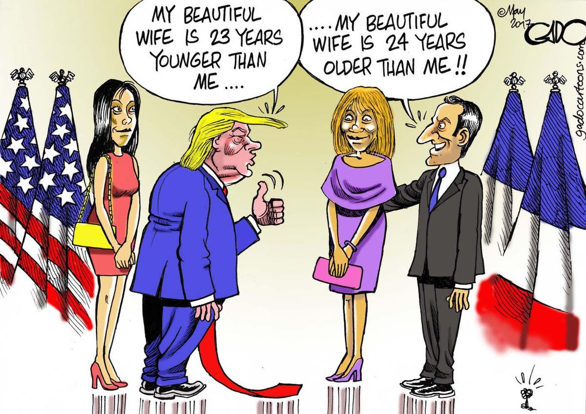 Macron est devenu une grande vedette aux Etats-Unis pour les caricaturistes: il est facile à croquer, mignon à dessiner et avec sa beauté de femme-mère à côté de lui, ils s’en donnent à coeur joie.