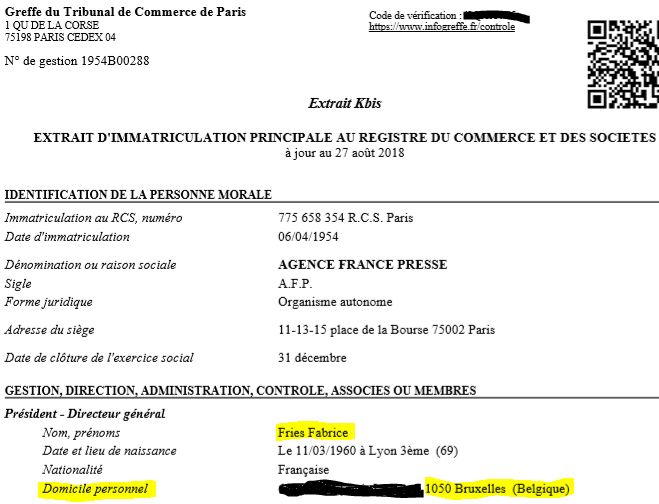 L’AFP exerçant de véritables missions de service public on peut s’attendre à ce que ses dirigeants et personnels soient exemplaires. Or le nouveau PDG de cette agence est domicilié en Belgique comme le prouve cet extrait Kbis daté du 27 août 2018 :
