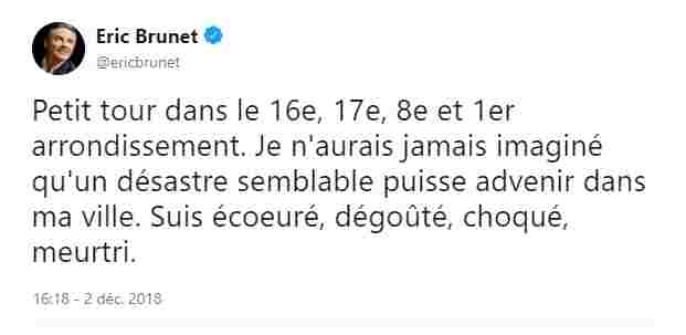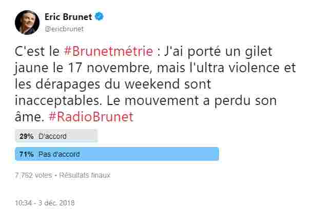 Mais Eric Brunet va vite déchanter. Les 2 et 3 décembre, il publie deux tweets empreints de déception. Car le mouvement des gilets jaunes échappe largement à la caricature de mouvement antifiscal que l’éditorialiste libéral avait voulu y voir, tant dans ses revendications…