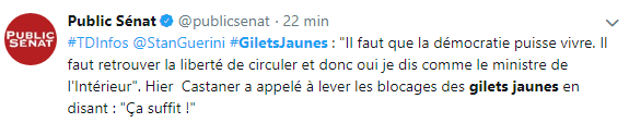 Si Macron estime qu’il est temps de tourner la page, les Gilets Jaunes estiment eux aussi qu’il est temps de tourner la page … de la présidence Macron. Le départ du Président et l’organisation de nouvelles élections parlementaires, propres, reste la revendication centrale. Qui ne pourra certainement pas être satisfaite. Une guerre des nerfs se met en place, la police tente de vider le territoire des Gilets Jaunes, mais ils ne sont pas attachés à un endroit particulier.