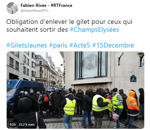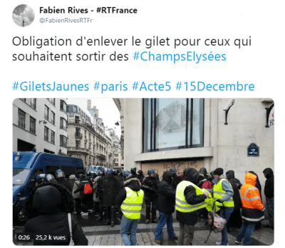 Dans le même temps, tout est fait pour donner l’impression que le mouvement est en perte de vitesse. Des gens sortis des trains allant vers Paris, ayant pourtant leur titre de transport, des bus bloqués et fouillés (voire renvoyés), des voitures aussi. L’on a vu tourner le chiffre de 40 000 personnes ainsi empêchées d’arriver dans le centre de Paris. Sans compter ceux obligés d’enlever leur gilet jaune.