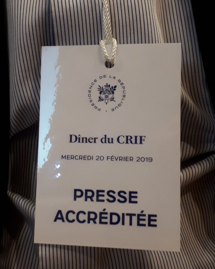Le 34e dîner du CRIF marque, plus encore que les précédents, l’union entre le CRIF et l’Etat. Les accréditations à la presse étaient d’ailleurs fournies cette année par les services de la présidence de la république, comme le montre la photo ci-dessus.
