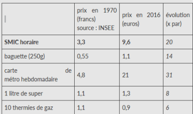 Explication du tableau : entre 1970 et 2016, le prix de la baguette a été multiplié par 14 et celui du super par 8 seulement, soit près de deux fois moins…