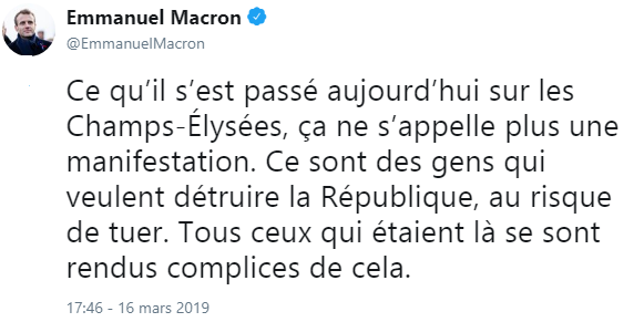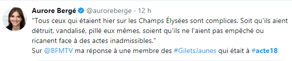 Veut-elle ainsi accuser Castaner d’avoir laissé faire ? Les CRS de n’être pas intervenus ? Ou bien les Gilets Jaunes de ne pas avoir fait le travail des forces de l’ordre, qui avaient manifestement reçu des consignes assez … étranges ?