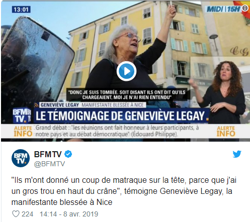 L’on se souvient de cette image qui a choqué, d’une femme de 73 ans avec un drapeau de paix, à terre, entourée des forces de l’ordre, du sang sur la tête lors de la manifestation des Gilets Jaunes du 23 mars à Nice. Elle fut hospitalisée pour des fractures multiples au crâne et aux côtes. Mais silence, rien ne doit filtrer, aucune responsabilité ne doit être mise en cause, sauf celle de la victime elle-même. C’est en tout cas la position de Macron. Rappelons ces