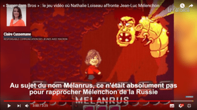 Quant à l’analogie avec la Russie (Melanrus), il paraît que c’est une interprétation extensive absolument infondée, c’est juste un hasard, pour trouver un surnom à Mélenchon. Vous pouvez écouter ici les explications totalement stupides de Claire Cussemane, responsable de communication des Jeunes avec Macron, qui sont à l’origine de cette oeuvre d’art politique :