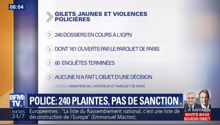 BFM-TV, « Gilets jaunes : où en sont les 240 enquêtes IGPN ouvertes pour des violences policières présumées ? », 10 mai 2019