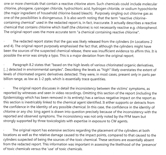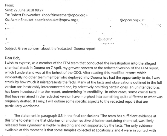 L’expéditeur de l’e-mail, qui se présente comme un membre de la mission envoyée en Syrie en avril 2018 par l’OIAC pour tenter de faire la lumière sur l’attaque présumée, affirme à l’un de ses supérieurs que des reformulations «trompeuses» ainsi que des omissions «sélectives» figureraient selon lui dans «la version corrigée [préliminaire] du rapport de la mission d’enquête», qui sera finalement publié officiellement le 1er mars 2019. «Un parti pris involontaire a été introduit dans le rapport, mettant à mal sa crédibilité. Dans d’autres cas, certains faits cruciaux qui ont été maintenus dans la version corrigée se sont transformés en quelque chose d’assez différent de ce qui a été rédigé dans l’ébauche», remarque celui qui a été identifié par WikiLeaks comme un expert de l’OIAC. Entre autres réécritures significatives, l’auteur cite un passage des conclusions du rapport préliminaire (dans sa version corrigée) selon lequel «l’équipe dispose à l’heure actuelle de preuves suffisantes pour établir que du chlore, ou un autre produit chimique réactif contenant du chlore, était vraisemblablement libéré des bouteilles». Et de faire remarquer qu’une telle affirmation «ne s’appuie pas sur les faits». «Le rapport initial soulignait délibérément le fait que, bien que les bouteilles aient pu être à l’origine de la libération suspectée de produits chimiques, les preuves étaient insuffisantes pour l’affirmer […] C’est un écart majeur par rapport au rapport d’origine», s’indigne encore l’auteur de l’e-mail.