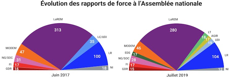 Elle résulte, premièrement, de la diminution du nombre de députés membres du groupe LREM : ses effectifs ont en effet baissé de 10 % depuis 2017, passant de 313 à 280, soit moins que la majorité absolue (289 sièges sur 577) (voir graphique ci-dessous).