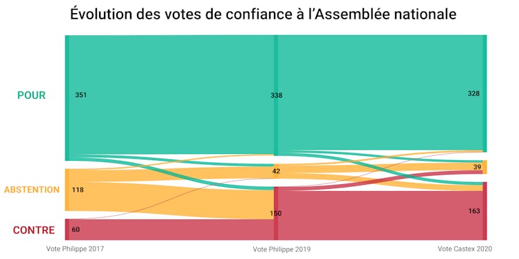 Le 15 juillet 2020, les membres des groupes La République en Marche (LREM), MoDem et Agir ensemble ont accordé leur confiance à Jean Castex. Les députés Les Républicains, socialistes, communistes et Insoumis ont largement voté contre. Le nouveau Premier ministre a ainsi obtenu la confiance de 345 députés, soit 61 % des votants. Une majorité confortable, mais plus faible que celles obtenues par Édouard Philippe en 2017 (370 voix, soit 65 %) et 2019 (363 voix, soit 63 %). Cette baisse n’a rien de surprenant.