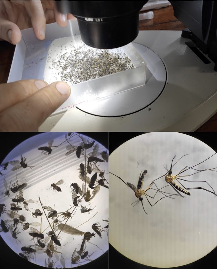 L’histoire ne serait évidemment pas complète sans les vecteurs de ces parasites ! Différentes techniques peuvent être utilisées pour échantillonner les insectes vecteurs. Leurs larves sont collectées dans l’eau où elles grandissent avant d’émerger en adultes.