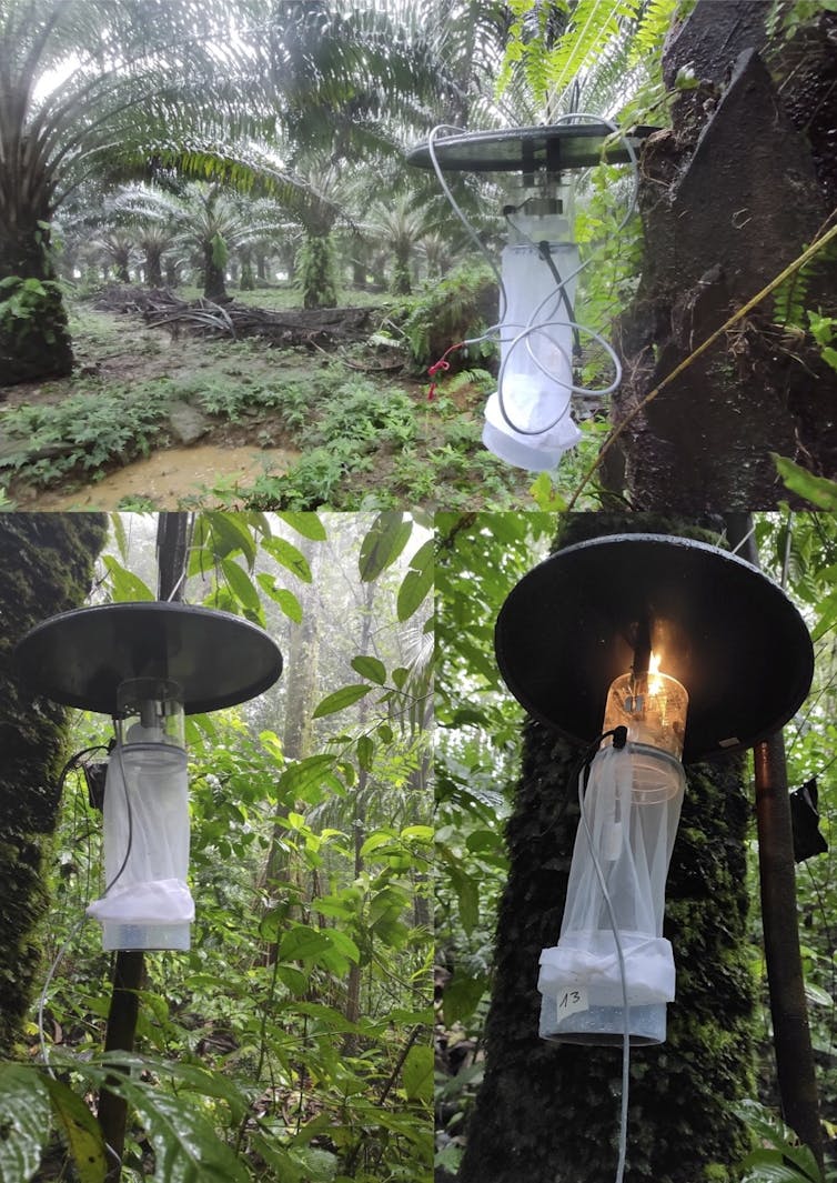 L’objectif principal consiste à évaluer comment les monocultures modifient la communauté de vecteurs et de leur pathogènes : des pièges sont accrochés aux arbres à différentes hauteurs et mis en route en fin de journée pour capturer les insectes tout au long de la nuit. Une batterie fait tourner un petit ventilateur qui aspire les insectes attirés par la lumière. Les nasses sont relevées le matin.