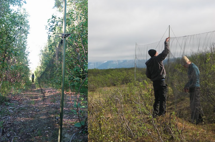 Sur cette photo prise en Alaska, nous installons des filets pour capturer les espèces de passereaux présentes sur 13 sites choisis, se répartissant sur un gradient latitudinal : d’Anchorage situé à 61ºN (sud de l’Alaska) jusqu’à Coldfoot situé à 67ºN (au-delà du cercle arctique).