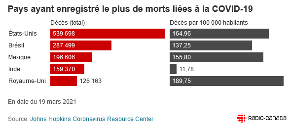 Précisons également que les moyennes nationales ne permettent pas non plus de voir les nuances à l’intérieur d’un pays ou d’une région. Ainsi, le taux de mortalité lié à la COVID-19 est de 221,8 pour 100 000 habitants à Montréal, alors qu’il est de 0 à l’Île-du-Prince-Édouard. La moyenne canadienne est de 59,4 pour 100 000.