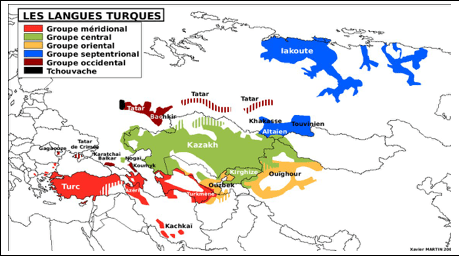 En dehors de la Turquie proprement dite, il existe aujourd’hui, à travers le Caucase et l’Asie centrale, une mosaïque de cinq Etats indépendants à majorité turcophone : l’Azerbaïdjan (10 millions d’habitants), le Kazakhstan (18,5 millions dont les deux tiers de la population est turcophone), le Kirghizstan (6,5 millions), l’Ouzbékistan (33,5 millions dont 80% d’Ouzbeks) et le Turkménistan (6 millions). Mais les populations turcophones existent au-delà des frontières de ces pays. Ainsi il y a plus d’Azéris en Iran (au moins 15 millions) qu’en Azerbaïdjan (9 millions), 20% des Ouzbeks vivent hors de l’Ouzbékistan (en Afghanistan, au Kirghizstan, au Kazakhstan, au Turkménistan, au Tadjikistan et en Russie). A contrario les Ouïghours sont aujourd’hui minoritaires au Xinjiang en raison d’une très forte immigration Han.