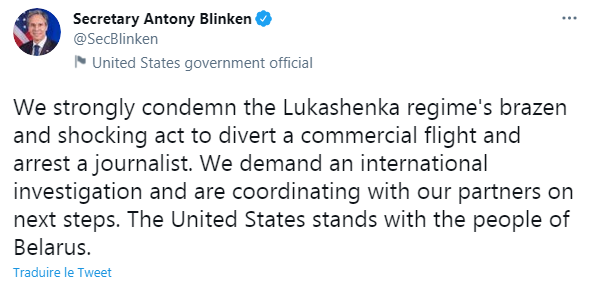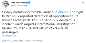 Cette opération expresse ne plaît évidemment pas du tout à la communauté internationale, qui parle de piraterie aérienne, de terrorisme d’Etat, qui en appelle à des sanctions européennes, qui a une enquête internationale – fermée selon l’OTAN, ouverte pour d’autres. La Pologne et la France ont convoqué l’ambassadeur biélorusse, toujours la Pologne mais avec la Lituanie appellent à fermer l’espace aérien européen aux avions biélorusses. Bref, la colère et l’indignation montent, nos dirigeants ont leurs vapeurs. Les Etats-Unis assurent guider dans cette voie leurs amis européens. Amen, nous sommes sauvés !