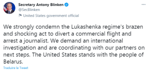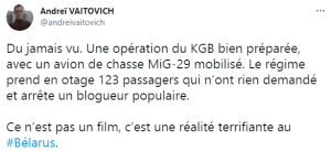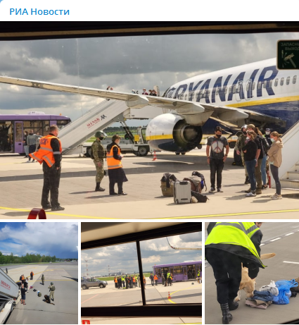 Roman Protassevitch, qui depuis novembre 2020 est sur la liste des personnalités convaincues de terrorisme, est interpelé et le Comité d’enquête biélorusse ouvre une enquête pour fausse alerte à la bombe, ce qui est passible de 5 années de prison.
