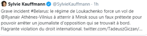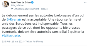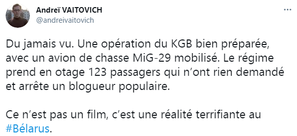 Cette hystérie collective doit s’appuyer sur de la matière, sur l’illusion que la Biélorussie aurait pris en otage tous les passagers, comme si elle en avait eu l’intention – pour quoi faire ? Au-delà de l’absurdité, il y a une véritable imposture, gonflée par les médias, qui s’indignent d’un fait qu’ils considèrent comme premier – l’interpellation d’un opposant n’aurait jamais eu lieu avant, c’est une honte, un scandale, ce ne sont pas des méthodes de pays démocratique. Donc, la Biélorussie, si besoin est encore de le prouver, est un véritable monstre.