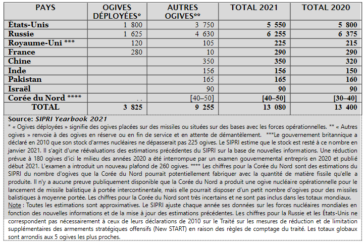 Les neuf États dotés d’armes nucléaires – États-Unis, Russie, Royaume-Uni, France, Chine, Inde,Pakistan, Israël et République populaire démocratique de Corée (Corée du Nord) – possèdent environ13 080 armes nucléaires début 2021. Cela représente une diminution comparée aux 13 400 armes nucléaires que le SIPRI avait estimées être en possession de ces États début 2020 (voir tableau ci-dessous).