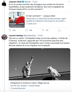 Et pour quelqu’un qui prétend détenir la vérité, il est frappant de constater à quel point rien de ce qu’il dit ne repose sur le moindre fait, référence ou étude. Attali se comporte comme un oracle dont la parole vaudrait vérité sans avoir à se justifier d’une quelconque manière. Malheureusement pour lui, les choix de Donald Trump et du Brexit ont permis des études récentes sur l’impact de l’immigration sur le marché de l’emploi qui contredisent sérieusement ses dires. C’est ainsi que The Economist rapportait en 2020 une étude d’un chercheur d’Harvard (deux canaux guère critiques de l’immigration) qui soulignait que la baisse de près de 40% du solde net migratoire des Etats-Unis en 2019 avait poussé les bas salaires à la hausse. Pour preuve, les hausses de salaires étaient les plus fortes dans les secteurs qui employaient le plus d’immigrés. De même, une étude britannique de 2018 montrait que la division par deux du flux migratoire en provenance de l’UE avait rééquilibré le rapport de force en faveur des travailleurs.