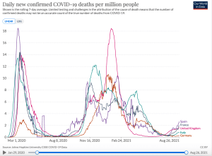 La macronie et bien des média en ont beaucoup rajouté au début de l’été sur cette quatrième vague de la pandémie. Il est vrai qu’en nombre de cas, elle reste importante. Mais même sur ce seul critère, il convient de remettre les choses en perspective et noter que le pic du nombre de cas est resté bien inférieur à celui de la vague précédente, de l’ordre de 25% en Grande-Bretagne ou en Espagne, de 40% en France, et même de 70% en Italie. Le pic remonte au 21 juillet outre-Manche et au 16 août pour notre pays. En outre, il convient de relativiser les chiffres français car l’instauration du passe a démultiplié le nombre de tests, gratuits, et rend probablement biaisées les comparaisons avec des périodes où il n’y avait pas le passe pour pousser à se tester aussi souvent que cela est le cas maintenant.