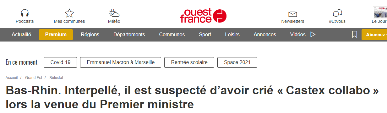 « Un Colmarien de 63 ans, présent à Sélestat pour suivre une manifestation anti-pass sanitaire, s’est retrouvé sur la place Maurice-Kubler. Il a insulté le Premier ministre. L’individu a vite été écarté par le service d’ordre. L’homme a ensuite outragé les policiers. Placé en garde à vue au commissariat de Sélestat, le Colmarien sera convoqué au tribunal correctionnel. »