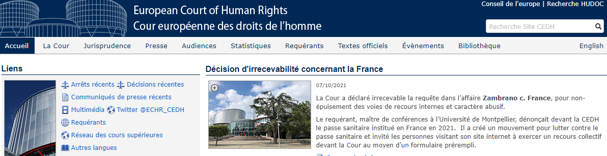M. Zambrano, maître de conférence à l’Université de Montpellier, a lancé un mouvement « No Pass » et incite les gens sur son site internet à remplir des formulaires-types de requête à déposer devant la CEDH. Et ça a marché, les gens ont réagi. Il fonde sa requête sur une violation de l’art. 3 (interdiction des traitements inhumains et dégradant), en rappelant que l’obligation vaccinale, qui découle de ces lois, fait d’un traitement en phase expérimentale un danger physique sans fondement médical réel. De plus, en se fondant sur les art. 8 (droit à la vie privée et familiale) et 14 (interdiction de la discrimination), le système de pass sanitaire qui en découle met en place un système discriminatoire, qui ne peut être justifié par la poursuite d’un but d’odre public légitime dans un système démocratique.