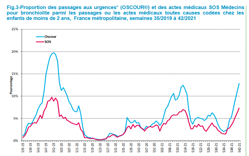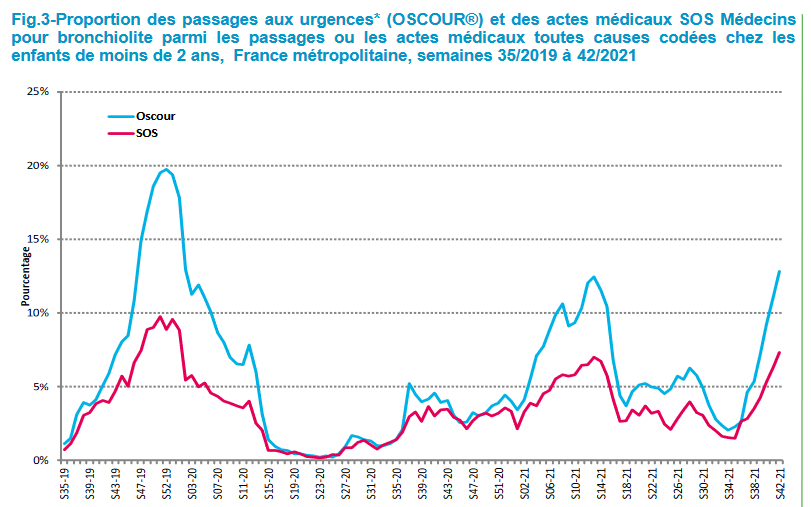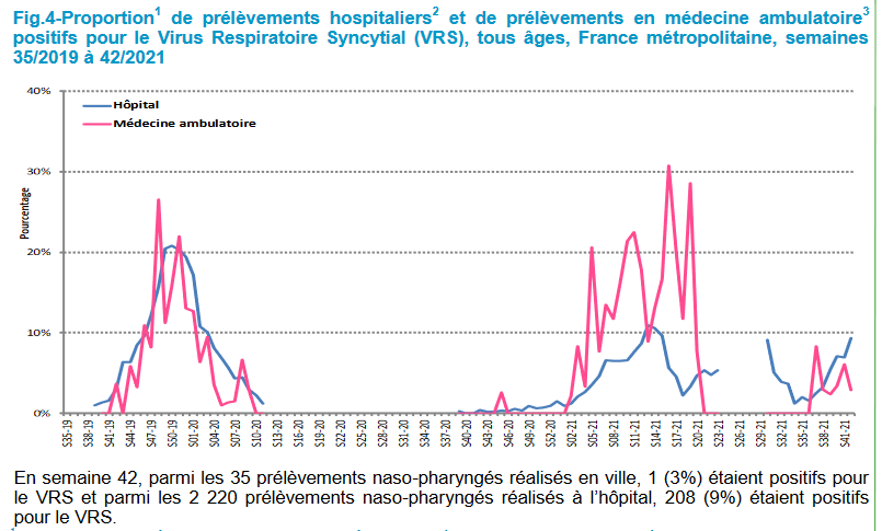 On peut y voir une vague « clinique » d’infections respiratoires graves chez les enfants, et étiquetées comme étant des « bronchiolites »… Il est important de noter que ces « bronchiolites » ne sont définies que par le codage clinique attribué à ces infections respiratoires pédiatriques sans que l’infection par le VRS (virus responsable de la bronchiolite) ne soit forcément recherchée ! Pourtant une bronchiolite est un syndrome (ensemble de symptômes) associé à une ÉTIOLOGIE particulière = infection par le VRS (Virus Respiratoire Syncytial). Et c’est là que les données de SPF posent problème…